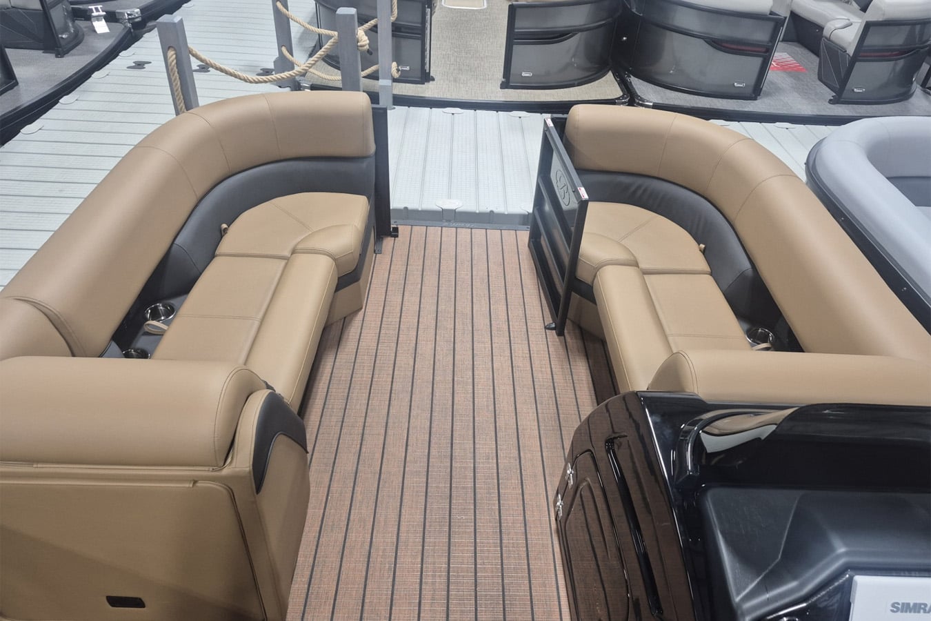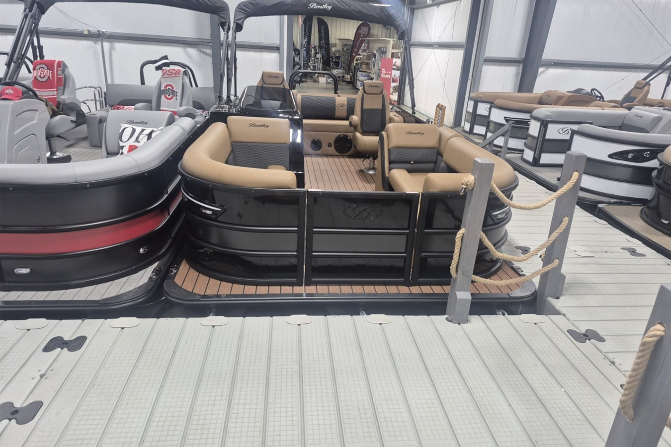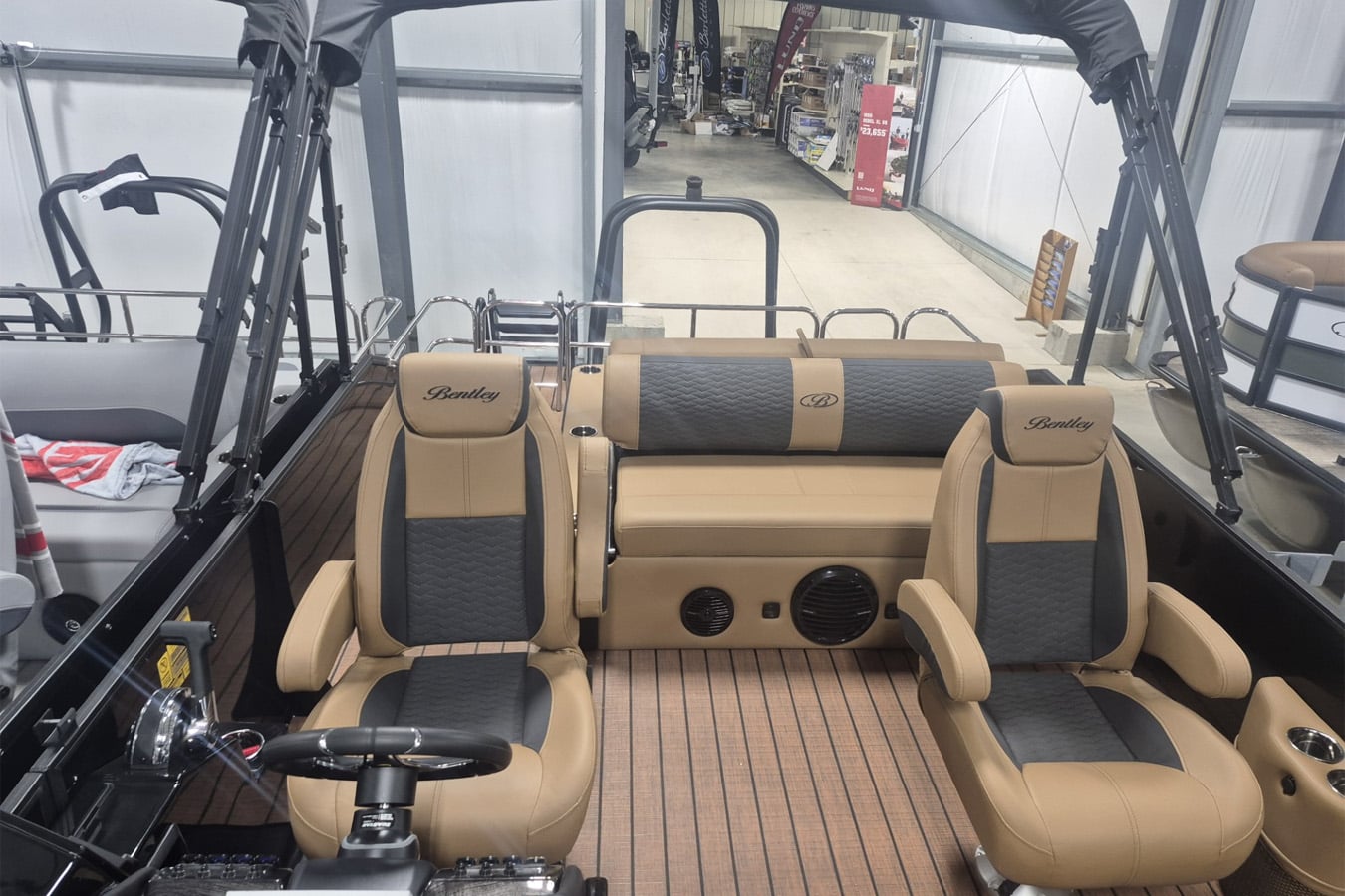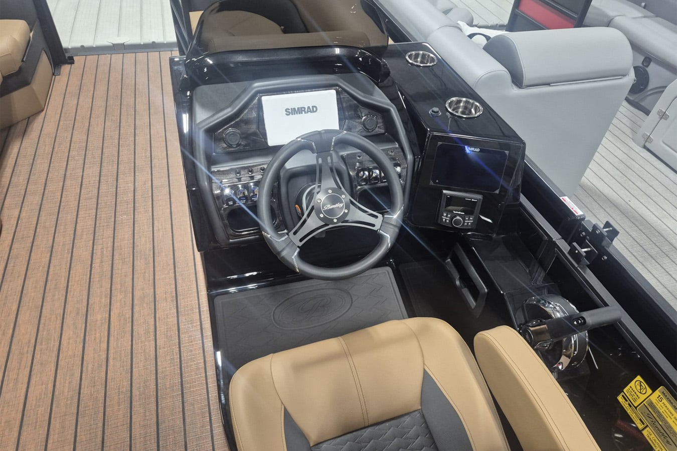 2026 Bentley Elite 223 Swingback Tritoon Pontoon & Mercury 4-Stroke EFI. This Matte Black Walls Tritoon 22' Swingback features front chaise lounge seating with storage, rear swingback lounge seating with multiple positions and storage, rear safety fencing, side-by-side highback reclining captain’s seats, interior blue LED package (lighted cup holders and courtesy lights), exterior blue LED light package with underwater and under deck lights, powder coated rails, stainless steel flip-up cleats, Simrad GPS touch screen gauges, Simrad GPS depth finder, ski tow bar, premium sound package with Bluetooth radio, six speakers and 10" subwoofer, wood grain table, raised fiberglass helm with storage, walnut teak vinyl flooring, playpen cover, hydraulic tilt steering, lifting strakes, underneath sheeting, Lillipad Easy Step ladder, 4 Fender Pro, LED docking lights, LED navigation lights, Brandy interior package, 25" tubes, wireless phone charger, multiple USB charging ports, lounge end table, new battery, electric bimini top, blackout package, black graphics package, EZ View bow gate, dog bowls, ski locker storage in tube, and a built-in 54-gallon gas tank.